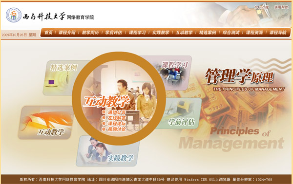 《管理学原理》是由经济管理学院和网络教育学院共同建设的一门管理学科专业基础课程。该课程以现代教育理念为核心,结合网络教育特点,强调教与学的统一。教学设计新颖,教学组织科学规范,导学、助学、促学措施完善。课程尤其注重教学过程、教学质量的跟踪管理,学习资源丰富,充分发挥了教师和学生的双向主导性和创造性。是一门具有鲜明特色和示范效应的网络教育课程。