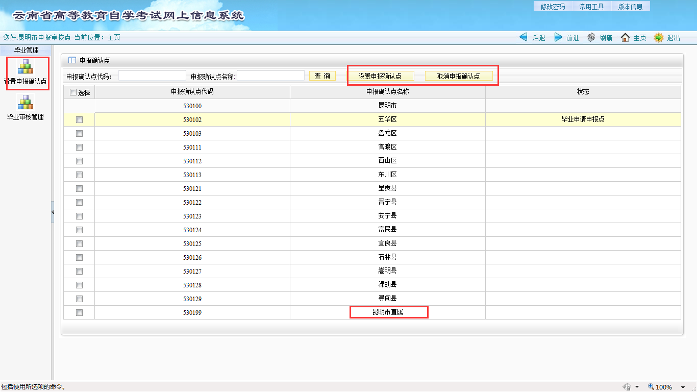申报审核点登录“云南省高等教育自学考试网上信息系统”成功后,将会看到功能模块:毕业管理-->设置申报确认点(可以设置或取消申报确认点)如图2-1所示: