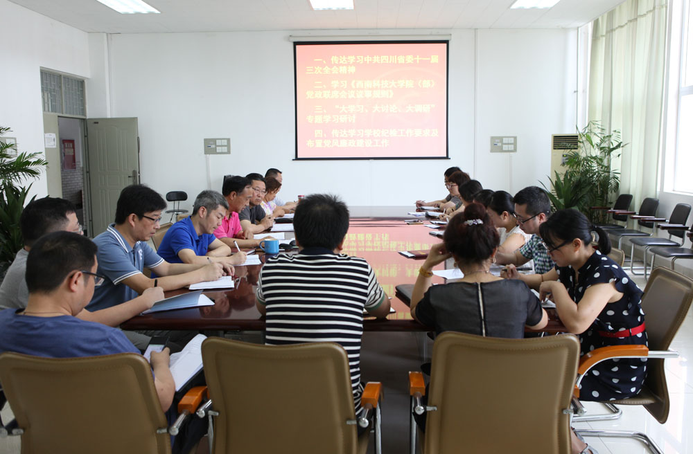 2018年7月5日下午,学院中心组召开“大学习、大讨论、大调研”暨党风廉政建设专题会,专题学习中共四川省委十一届三次全会精神、《36365线路检测中心入口院(部)党政联席会议议事规则》、学习学校纪检工作要求,布置了党风廉政建设工作。学院中心组(扩大)成员参加了会议。