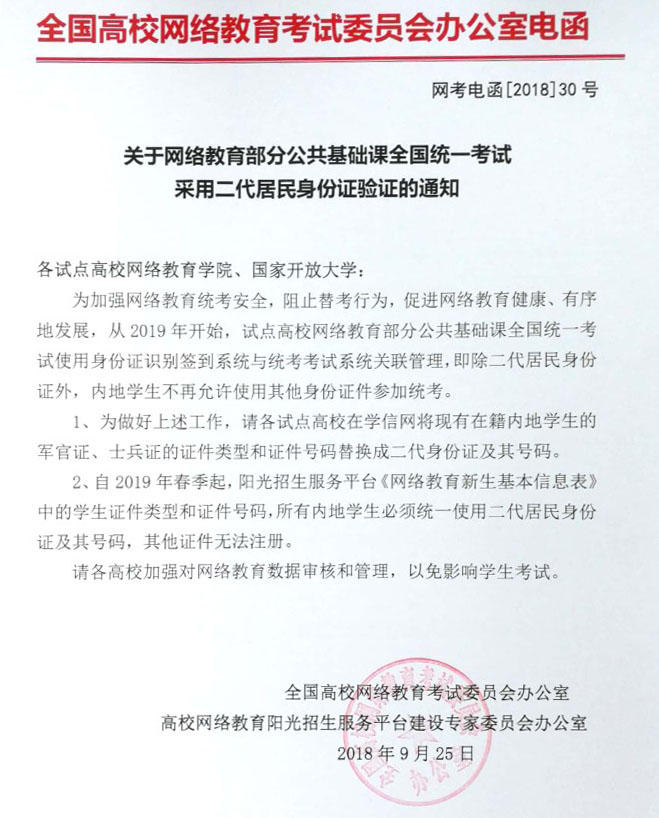 根据全国高校网络教育考试委员会办公室《关于网络教育部分公共基础课全国统一考试采用二代居民身份证验证的通知》(网考电函[2018]30号)要求,现将该通知转发给你们。请及时通知学生按要求提供证件变更材料,以免影响学生报考。