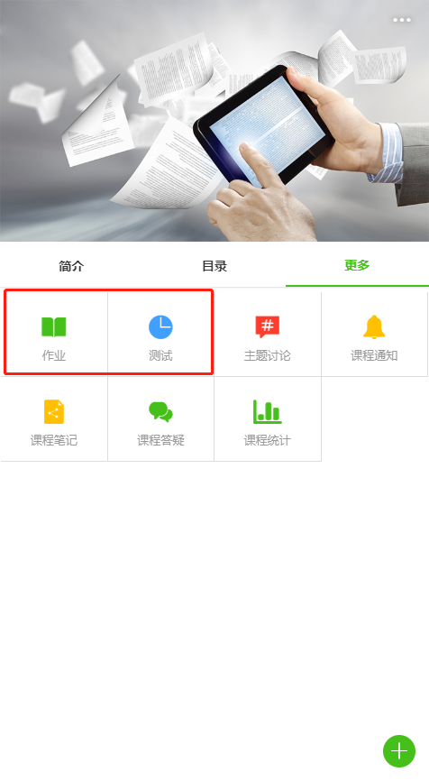点击“更多”菜单即可查看课程通知,参与主题讨论、课程答疑,完成在线作业和测试。