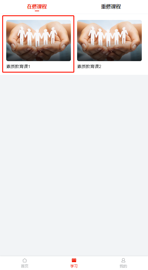 点击进入素质教育课1或2,点击”课程“菜单,点击想要学习的课程,点击”报名学习“即可完成选课