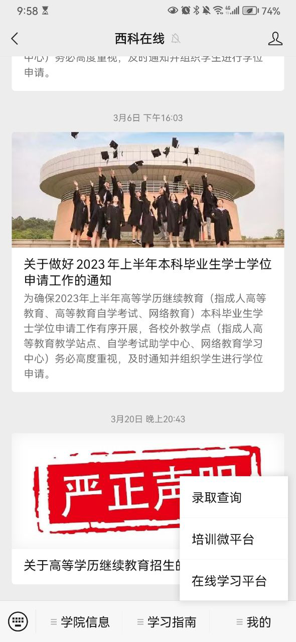 关注后进入”西科在线“微信服务号,点击”我的“菜单-->"在线学习平台",进入学习页面。首次登录请输入学号、密码(与学生工作室账号密码相同)进行登录,绑定登录成功后下次可免登录。