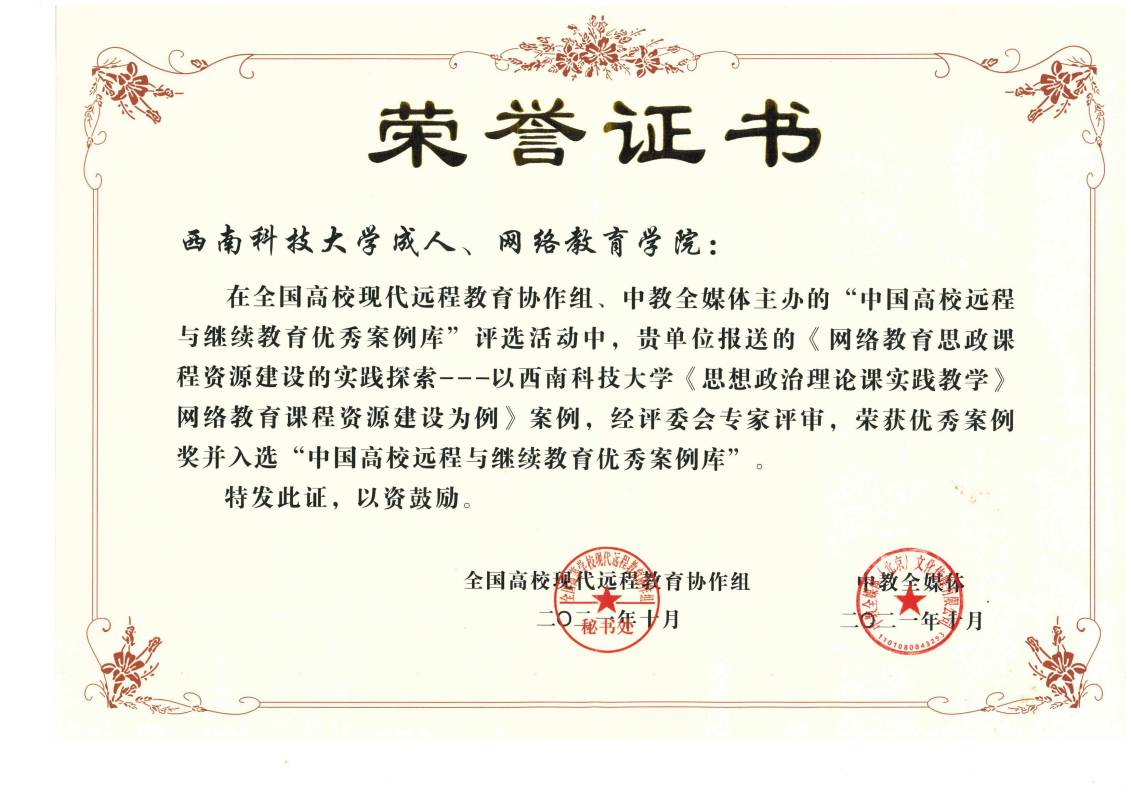 由师礼、黎万和、李昌国、李群山、孙霞、张嘉友撰写的《网络教育思政课程资源建设的实践探索——以36365线路检测中心入口<思想政治理论课实践教学>网络教育课程资源建设为例》案例,获“2021中国高校远程与继续教育优秀案例奖”,并入选《中国高校远程与继续教育优秀案例库》。