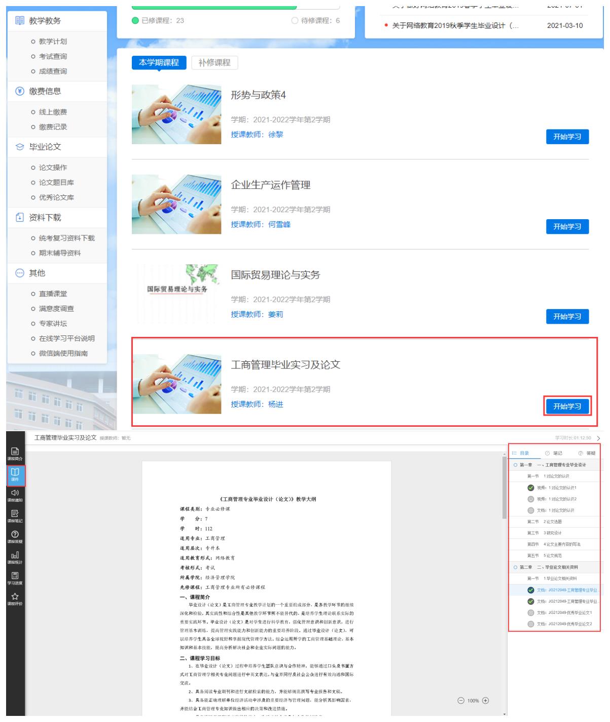学生登陆学生工作室,在本学期课程中,认真学习各专业毕业设计(论文)课件资源,了解毕业设计(论文)教学大纲、毕业设计(论文)撰写指南、学习对毕业设计(论文)的认识、选题要求、论文主要内容的写法,论文规范等相关内容。