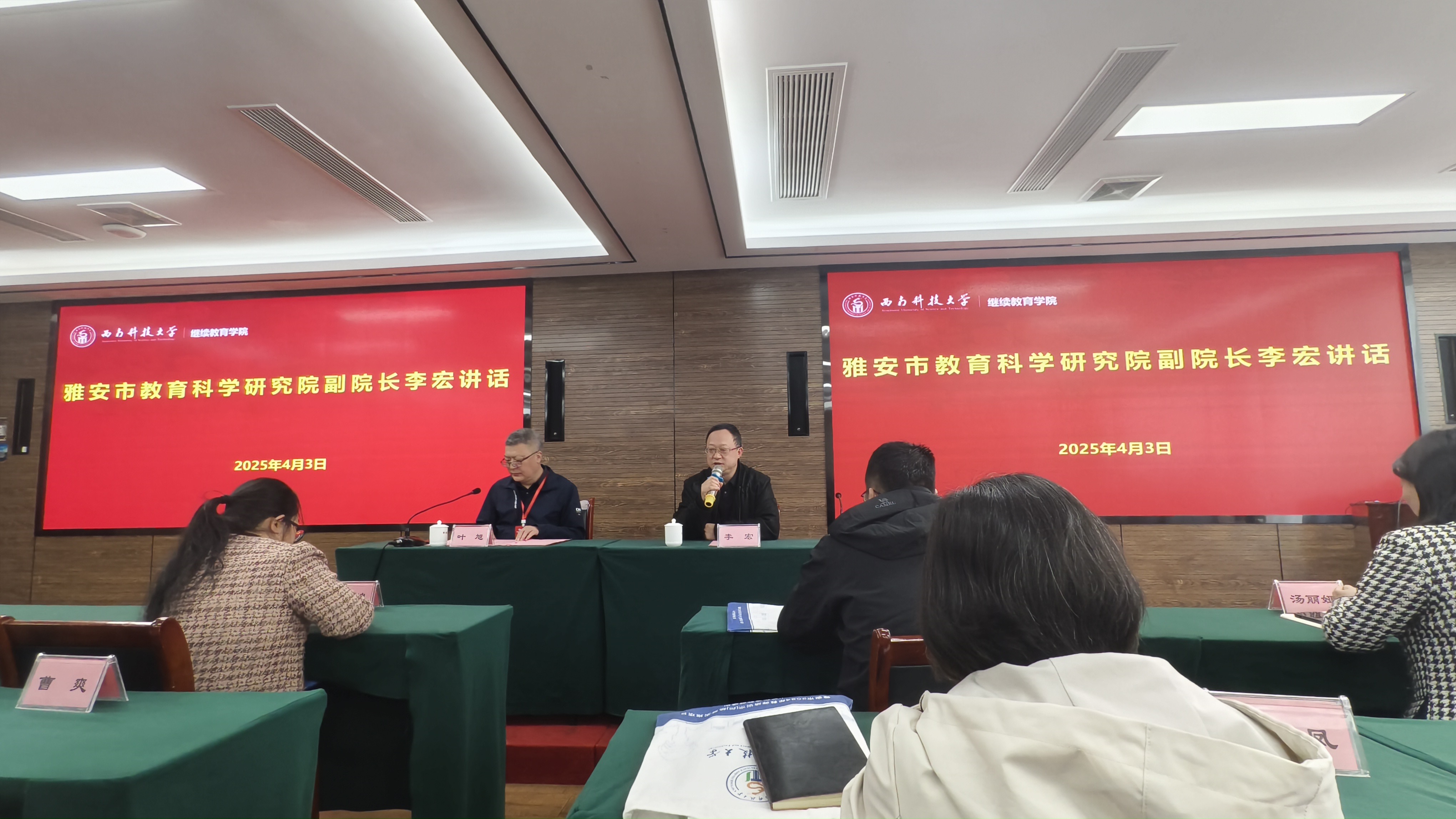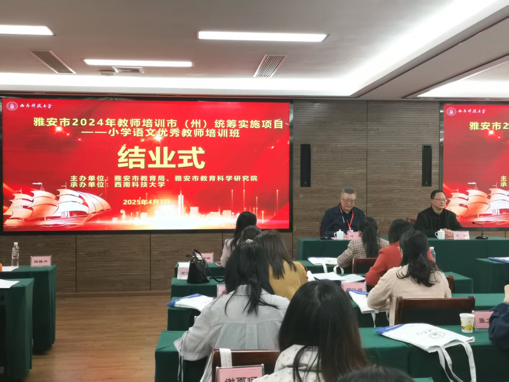 2025年4月3日,由雅安市教育局、雅安市教育科学研究院主办,36365线路检测中心入口承办的雅安市2024年教师培训市(州)统筹实施项目——小学语文优秀教师培训班结业式在雅安市新雅州酒店举行。雅安市教育科学研究院副院长李宏、36365线路检测中心入口院长叶旭、培训班管理服务团队、后勤安全保障人员以及全体参训教师出席结业式。结业式由叶旭主持。