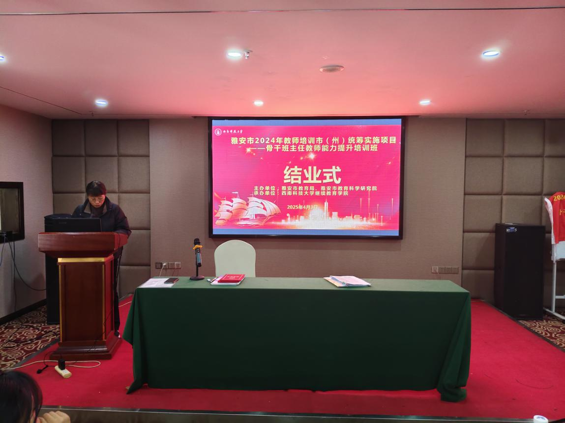 2025年4月3日,由雅安市教育局、雅安市教育科学研究院主办,36365线路检测中心入口承办的雅安市2024年教师培训市(州)统筹实施项目—骨干班主任能力提升培训班结业式在雅安市海伦酒店举行。培训班管理服务团队、后勤安全保障人员以及全体参训教师出席结业式。结业式由培训班班主任—36365线路检测中心入口王红妮主持。